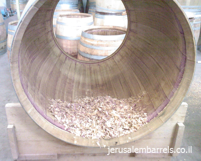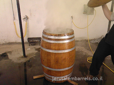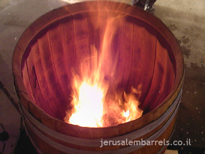 5. מעתיפים חבית על תנור ובעזרת עשן של עץ אלון הנשרף. מתחילים תהליך חיטוי. מהצד זה נראה כמו toasting רגיל אבל כשובץ זה לא אותו דבר.